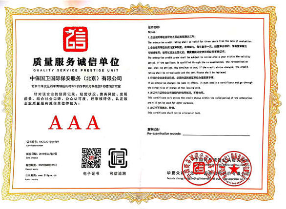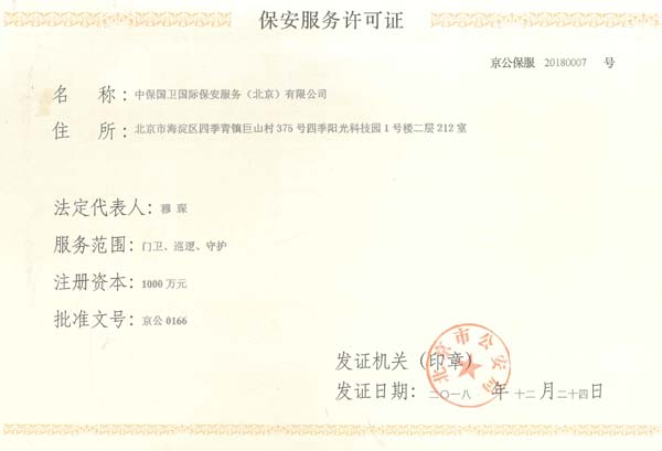 中保國衛(wèi)國際保安服務(北京)有限公司,屬中保國衛(wèi)集團旗下子公司。能全方位的為大型客戶提供優(yōu)質的安保、押運服務,是集人防和技防于一體的新型正規(guī)化綜合安保押運服務企業(yè),提供人防、物防、技防、聯網報*、非武裝押運等安防相關的一站式服務。